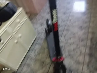 Patinete de color negro con detalles en rojo. - Manillar ajustable. - Ruedas de goma. - Freno trasero.