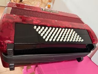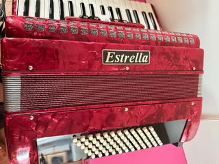 Acordeón de la marca Estrella en color rojo. - Diseño brillante y llamativo. - Teclado blanco y negro. - Botones de bajos. Sin usos, costo 1400 euros solo una pequeña marca.