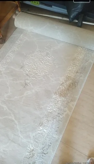 Alfombra de diseño elegante, ideal para añadir un toque de distinción a tu hogar. Su textura y patrón la hacen única. - Diseño con motivos ornamentales. - Borde decorativo a lo largo de los laterales. - Acabado con un sutil brillo. Es nueva sin estrenar, tiene la medida de 1metro de ancho y 5metros de largo.