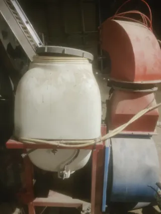 Cañón pulverizador con depósito de 400 litros. - Depósito de plástico blanco. - Estructura de soporte metálica roja. - Manguera amarilla. - Boquilla roja. - bomba de sulfato aps 51
