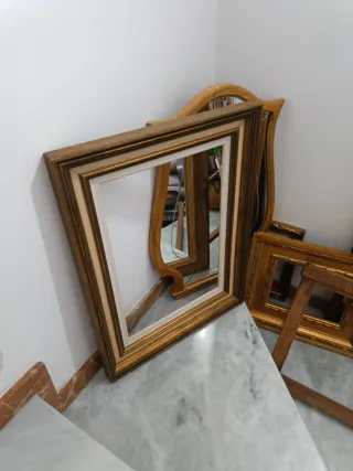 Conjunto de marcos y espejos con un diseño elegante. Precio por Unidad Pregunta tus dudas sin compromiso - Marcos de madera con detalles dorados. - Espejos con marcos curvos y rectos. - Ideal para añadir un toque clásico a tu hogar.