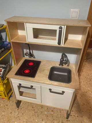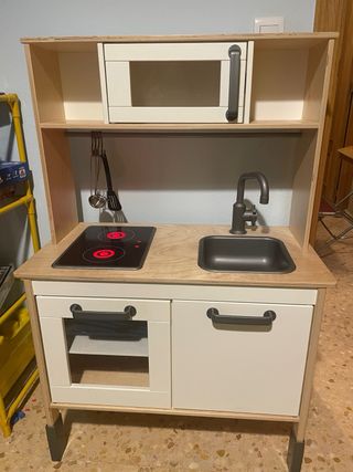 Divertida cocina de juguete para que los más pequeños desarrollen su imaginación. - Encimera de madera. - Fogones con luces rojas. - Fregadero. - Horno con puerta. - Microondas. - Accesorios de cocina.