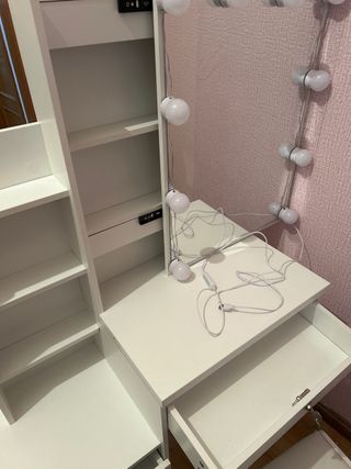 Tocador prácticamente nuevo, usado solo un mes. Se vende por mudanza. - Espejo con luces integradas. - Cajón con cerradura. - Estanterías laterales. - Taburete a juego.
