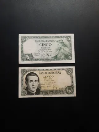 Lote de 2 billetes de España circulados pero en buen estado de 5 pesetas de 1954 y 1951 los dos con serie. Posibilidad de envío ordinario bajo responsabilidad del comprador. Crea tu lote o anuncio con los billetes que quieras.
