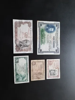 Lote de 5 billetes de España circulados de distintos valores y años. Se envían los billetes de las fotografias. Posibilidad de envío ordinario bajo responsabilidad del comprador. Crea tu lote o anuncio con los billetes que quieras.