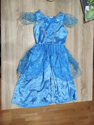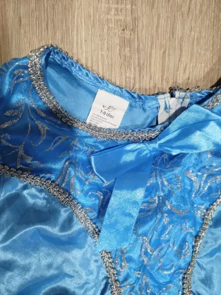Disfraz de princesa en color azul, ideal para fiestas o carnaval. - Mangas abullonadas de tul con brillos. - Detalle de lazo y adornos plateados en el corpiño. - Falda con varias capas de tela y detalles brillantes.