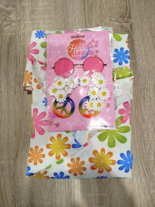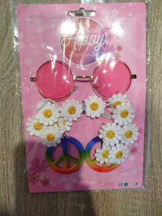 Conjunto de disfraz estilo hippie para mujer. Incluye accesorios para completar tu look. - Gafas redondas con lentes rosas. - pendientes - cinta de pelo margaritas
