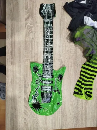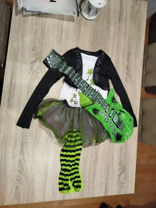 Disfraz de rockera para niña de 7 a 8 años. Incluye varios accesorios para un look completo. - Falda de tul verde y morado con purpurina. - Top blanco con estrellas verdes y chaqueta negra. -Tutu verde y morado. - Medias a rayas verdes y negras. - Guitarra hinchable verde con diseño de rock. ** La camiseta lleva dos manchas q se ven en la foto que no se van. Se ven poco. ** Las medias llevan una carrera en la parte de arriba pero aun se pueden aprovechar o poner otras.