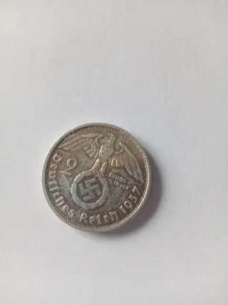 Moneda de plata de 2 Marcos del Reich Alemán, con fecha de 1937. - Diseño con águila imperial y esvástica. - Inscripción Deutsches Reich 1937 y 2 Reichsmark.