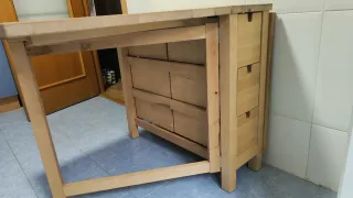 Mesa abatible de madera de la serie NORDEN de IKEA. Su diseño permite plegar uno o ambos laterales para adaptarla a tus necesidades. - Tablero de madera maciza. - Patas robustas para mayor estabilidad. - Cajones integrados para almacenamiento. En muy buen estado. Se puede ver en los detalles de las esquinas que están perfectas.