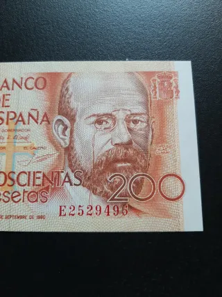 Billete de España en muy muy buen estado de 200 pesetas de 1980 con serie E. Posibilidad de envío ordinario bajo responsabilidad del comprador. Crea tu lote o anuncio con los billetes que quieras.
