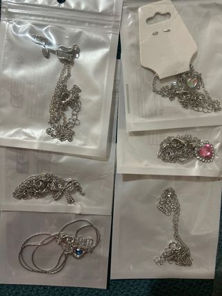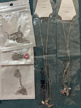 Conjunto de collares plateados con diferentes colgantes. - Collar con colgante de corazón iridiscente. - Collar con lazo y detalles brillantes. - Collar con piedra rosa. - Collar con corazón azul.