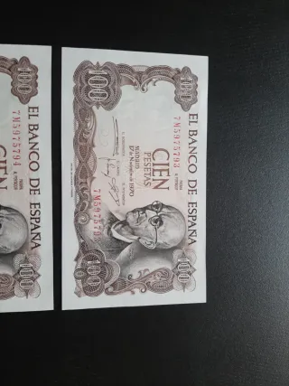 Lote de 2 billetes de España en muy buen estado de PAREJA CORRELATIVA de 100 pesetas de 1970 con serie 7M. Posibilidad de envío ordinario bajo responsabilidad del comprador. Crea tu lote o anuncio con los billetes que quieras.