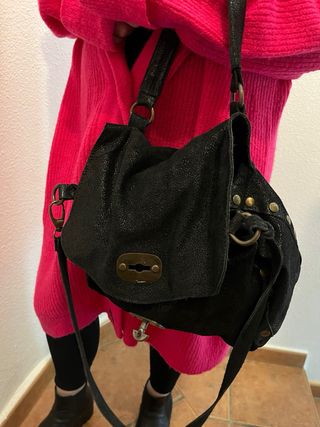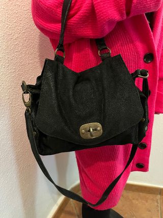 Bolso de mano o al hombro con un diseño moderno y práctico adornado con tachuelas en los lados. 26x33x9 cm aproximadamente. Tres compartimentos (mediano con cremallera) u varios bolsillos en en interior. - Cierre metálico tipo solapa. - Asa corta y correa larga con enganche de un lado. - Acabado texturizado de piel nobuck de tacto ante suave pero más resistente. Las partes metálicas y cierre metálico envejecidos.