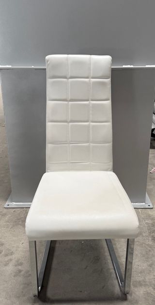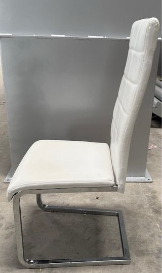 Conjunto de 4 sillas de comedor con un diseño moderno y elegante. Están en excelente estado, casi sin uso. - Tapicería de polipiel blanca. - Patas de metal plateado.