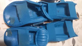 Par de protecciones de karate en color azul. Diseñadas para ofrecer seguridad durante la práctica. - Cierre con cintas elásticas. - Material sintético. - Marca: Leo R.