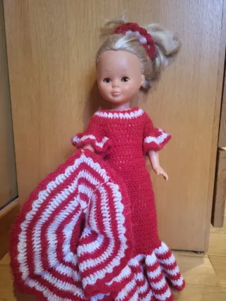 Muñeca Nancy antigua con un bonito vestido de crochet rojo y blanco. Incluye un accesorio para el pelo a juego. - Vestido de crochet con detalles blancos. - Accesorio para el pelo. - Diseño de volantes en mangas y falda.