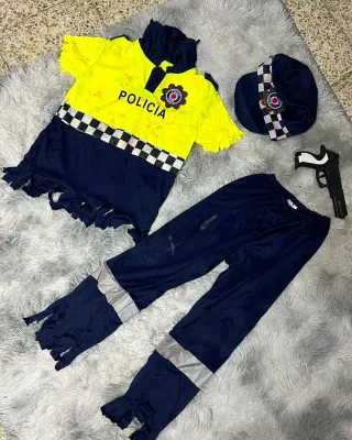 Disfraz de policía para niños, ideal para fiestas o juegos. - Camisa amarilla con detalles de policía. - Pantalón azul marino. - Gorra a juego. - Pistola de juguete incluida.