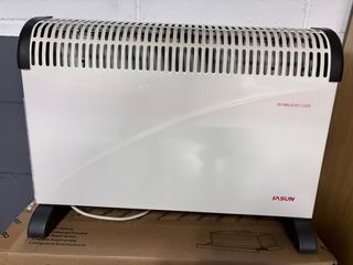 Calentador eléctrico de la marca JASUN, ideal para mantener tu espacio cálido. - Diseño moderno y funcional. - Cubierta superior con rejilla para una óptima distribución del calor. - Indicación de advertencia DO NOT COVER impresa en el lateral.