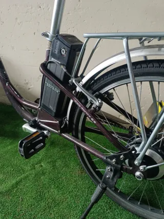 Bicicleta eléctrica Monty de color morado. - Cuadro de aluminio. - Ruedas de 26 pulgadas. - Batería integrada. - Portabultos trasero.