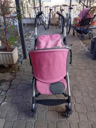 Cochecito de bebé en color rosa, ideal para paseos. - Estructura metálica. - Capota ajustable. - Asiento acolchado.