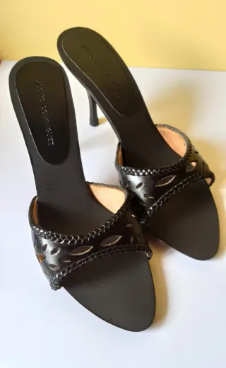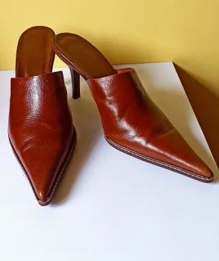 Elegantes zapatos de tacón de Zara abierto por detrás. - Diseño de punta fina. - Tacón de aguja. - Material de piel. - Talla 40. - Utilizados 2 ó 3 veces. - Sin caja