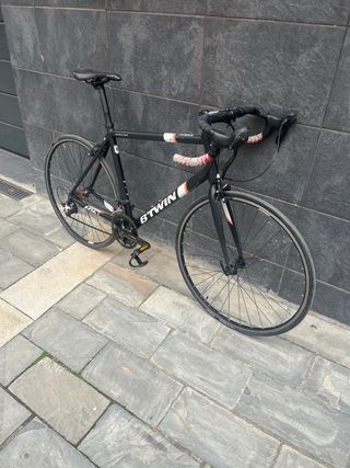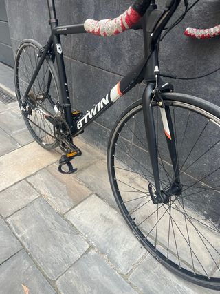Bicicleta de carretera Btwin en color negro. - Cuadro de aluminio. - Ruedas de 700c. - Manillar de carretera. En buenas condiciones en general!!! Habria solo que cambiar el grip del manillar que esta bastante desgastado!