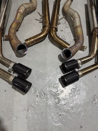 Sistema de escape completo para Mercedes-Benz G63 AMG, incluye downpipes. - Fabricado en acero inoxidable de alta calidad. - Diseño deportivo con puntas de fibra de carbono. - Componentes diseñados para mejorar el rendimiento.