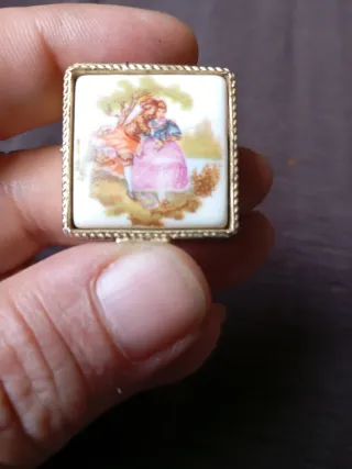 Pastillero vintage de porcelana con detalles en bronce, datado de los años 50. Presenta una escena romántica pintada a mano. - Materiales: Porcelana y bronce. - Diseño: Escena romántica. - Época: Años 50.