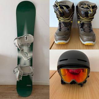 Conjunto completo para disfrutar del snowboard. Incluye tabla, botas y casco. - Tabla de snowboard (made in italy) verde con fijaciones freestyle burton blancas. - Botas de snowboard color marrón con cordones amarillos. - Casco de snowboard poc profesional negro con gafas adicionales. Ultimo mantenimiento tabla Nov-2025 Casco y Fijaciones compradas en Dic-2025