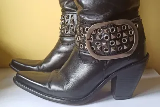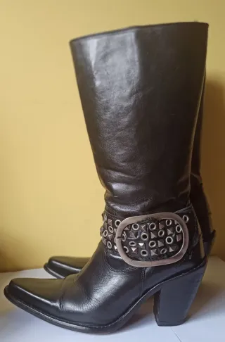 Botas de caña alta. - Material: Cuero. - Color: negro. - Detalle: Tachuelas metálicas en la correa y hebilla plateada. - Punta afilada. - Tacón grueso. - Talla 38. - Sin caja.