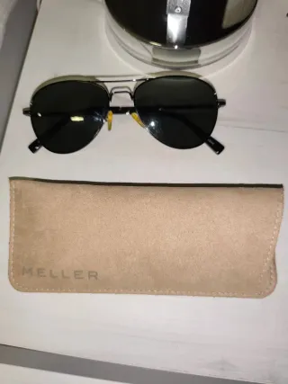 Gafas de sol estilo aviador de la marca Meller. Combinan un diseño clásico con detalles modernos. - Montura metálica en color negro. - Lentes oscuras para una protección óptima. - Incluye funda protectora con el logo de la marca.