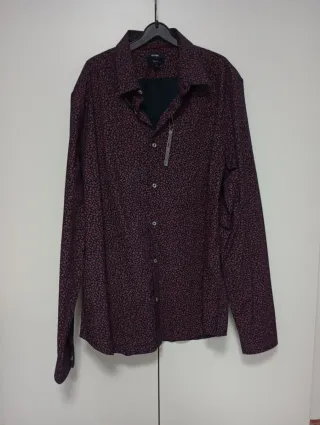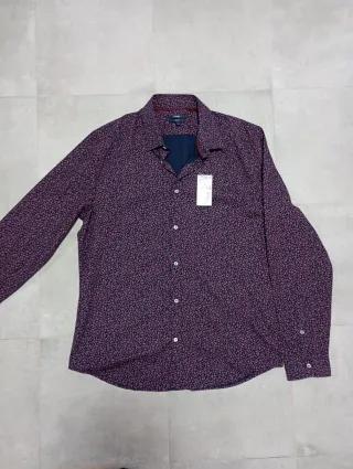 Nunca usada. Camisa de manga larga con un estampado original de hojas en tonos azul marino y burdeos. Cuello camisero y puños abotonados. Ancho: 48cm Largo: 78cm