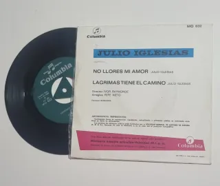 Disco de vinilo del artista Julio Iglesias. - Título de la cara A: No llores mi amor. - Título de la cara B: Lagrimas tiene el camino. - Sello discográfico: Columbia. - Referencia: MO 632.