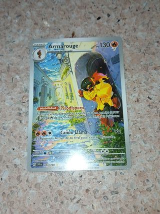Carta Pokémon de Armarouge, edición Ilustrador. - Número de carta: 203/198. - Habilidad: Pirodisparo. - Ataque: Cañón Llama (90 PS). - Debilidad: x2. - Resistencia: -30. - Coste de Retirada: 2.