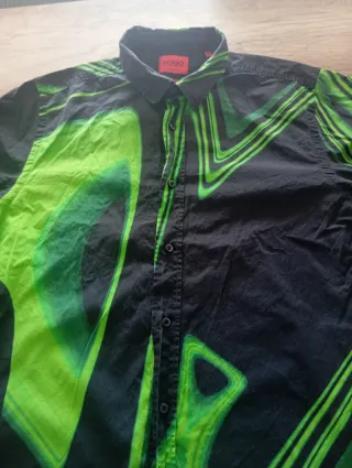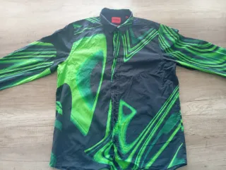 Camisa de manga larga con un llamativo estampado. - Diseño abstracto en tonos verdes y negros. - Cuello clásico. - Cierre de botones. Se hacen envíos