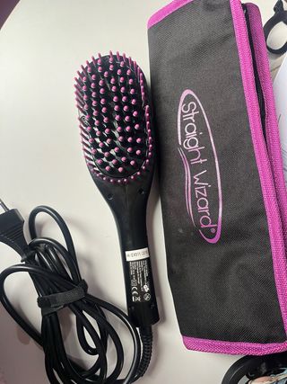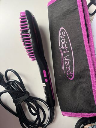Cepillo eléctrico para alisar el cabello. - Mango ergonómico en color negro. - Cerdas de color rosa. - Incluye funda de transporte. - Cable de alimentación.