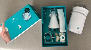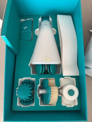 Dispositivo GLO 910 con varios accesorios. - Incluye el dispositivo principal. - Viene con diferentes cabezales para distintas funciones. - Presentado en su caja original con compartimentos.