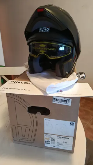 Casco modular AGV de color negro, talla L 59-60cm. Incluye visor solar ajustable y lente antivaho Pinlock. Me equivoqué de talla por eso su venta A ESTRENAR - Visor solar integrado. - Preparado para Pinlock. - Cierre micrométrico. - Unos de los más silencioso del mercado con solo 85 decibelios a 100km/h - Elegante y sobrio. - Acabados de lujo