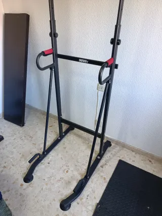 Conjunto de equipamiento para entrenamiento en casa, ideal para ejercicios de fuerza y tonificación. - Estructura de dominadas negra. - Tres juegos de mancuernas de diferentes pesos.