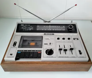 Radio cassette de la marca Sony, modelo CF-650, un clásico de los años 70. -Funcionando 220v. - Diseño retro con acabados plateados y detalles en madera. - Antenas extensibles para una mejor recepción de radio. - Compartimento para cassette con botones de control. - Indicadores de nivel de grabación y sintonizador de radio AM/FM. Medidas: ancho 42 fondo 31 alto 14