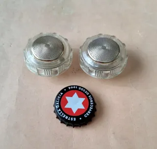 Dos botones para radio antigua, fabricados en perpex y metal. -ideales para radios de Años 50 - Son Originales. NO copias de resina - Diseño con detalles en espiral y acanalados en metal dorado. Lote número 41