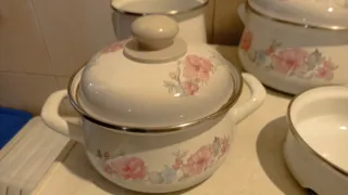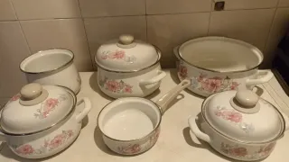 Conjunto de cazuelas esmaltadas con un bonito diseño floral. - Base blanca con detalles en rosa y azul. - Asas y bordes plateados. - Incluye cacerolas de diferentes tamaños y un cazo.