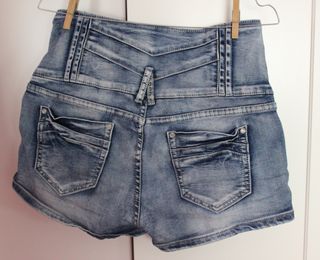 Shorts vaqueros de tiro alto con un diseño moderno y favorecedor. Talla XL pero tallan poco - Cintura alta. - Cierre de botones. - Bolsillos delanteros y traseros. - Efecto desgastado.