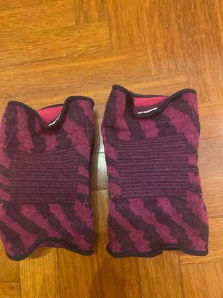 Par de rodilleras Kipsta con un llamativo estampado. - Diseño de rayas en morado y negro. - Tejido elástico y cómodo. - Marca Kipsta visible.