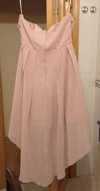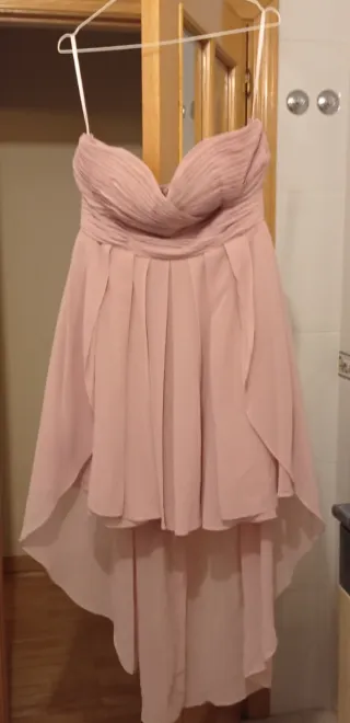 Vestido de fiesta con un diseño elegante y moderno. - Escote palabra de honor. - Falda con vuelo y corte asimétrico. - Detalle de pliegues en el cuerpo. - Tejido ligero y vaporoso.