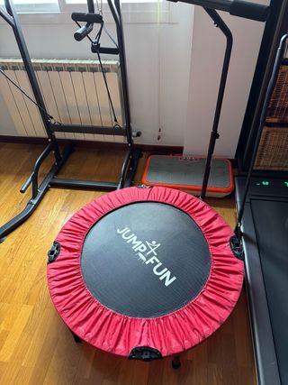 Cama elástica redonda con funda protectora. - Utilizada 2 veces - Diámetro aproximado de 1 metro. - Color rojo de la funda. - Diseño con logo Jump Fun. - Desmontable - Se puede enviar