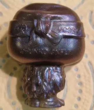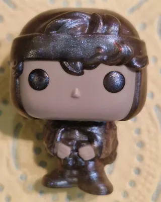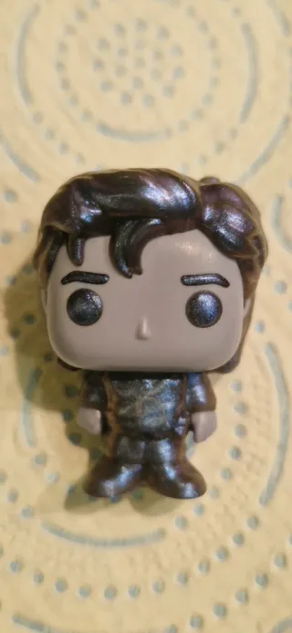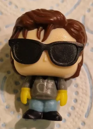 Figura coleccionable de estilo Funko Pop. Presenta gafas de sol negras y cabello castaño. - Cuerpo con camiseta gris y guantes amarillos. - Pantalones azules y zapatos negros.