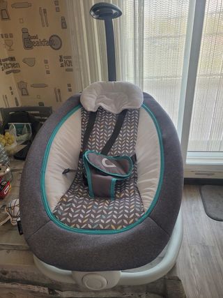 Hamaca balancín para bebé hasta 9 kilos, con 3 posiciones de inclinación y 12 melodías diferentes . Correa de seguridad en 5 puntos. Patas antideslizantes. Suave cojín desmontable 2 juguetes adicionales. Montaje fácil y rápido. Se puede plegar para guardar. Usado 2 veces, nada más. Está como recién comprado.