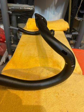 Manillar y potencia de bicicleta retirados de una unidad nueva. - Color negro mate. - Diseño curvo. - Marcas de ajuste grabadas.